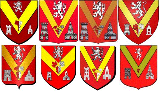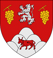 De gueules au chevron renversé d’or chargé en pointe d’une grappe de raisin feuillée de deux pièces, partie de gueules et d’argent, accompagné en chef d’un lion d’hermine et en pointe à dextre d’une tour et à senestre d’une chapelle, le tout d’argent, maçonné de sable, ajouré et ouvert du champ.