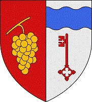 Parti ; au premier de gueules à une grappe de raisin d’or, au second d’argent à une clé de gueules accompagnée en chef d’une devise ondée d’azur.
