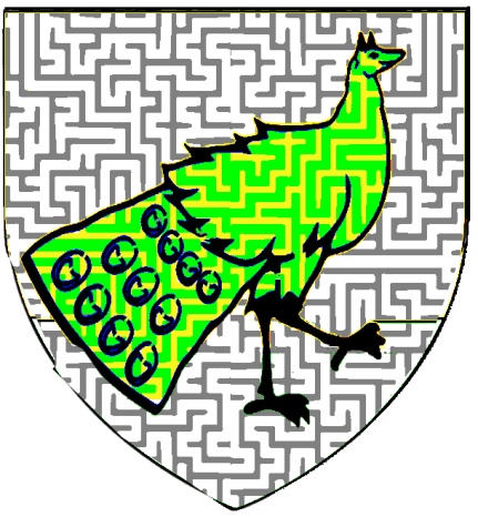 De sable à l’oeuf de dragon d’argent, surmonté en chef à dextre de deux marmottes affrontées et à sénestre d’une hulotte, le tout d’argent aussi et d’or, accompagné à sénestre de deux gnomes affrontés au naturel.