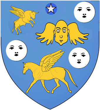 Coupé mi-parti en chef, de sinople, d’or, d’azur, la 1 chargé d’un demi-vol posé en pal, d’argent, le 2 au braque assis, de gueules, le 3 à l’épée de mousquetaire posée en fasce, d’or.
