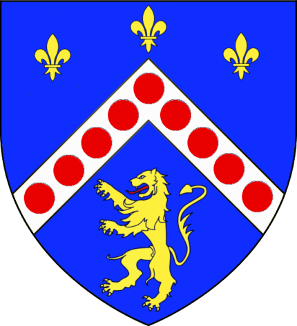D’azur au chevron d’argent chargé de 11 tourteaux de gueules,