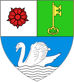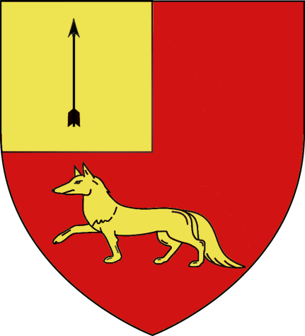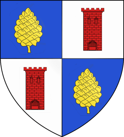 Ecartelé d’azur et d’argent, le 1 et le 4 à la pomme de pin d’or posée en pal, le 2 et le 3 à la tour de gueules.