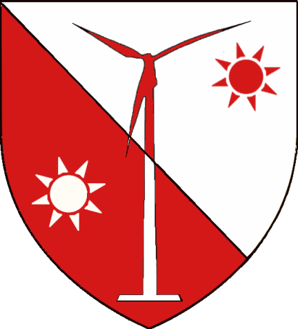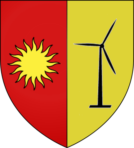 Tranché d’argent et de gueules aux deux soleils de l’un à l’autre, à l’éolienne de l’un en l’autre.