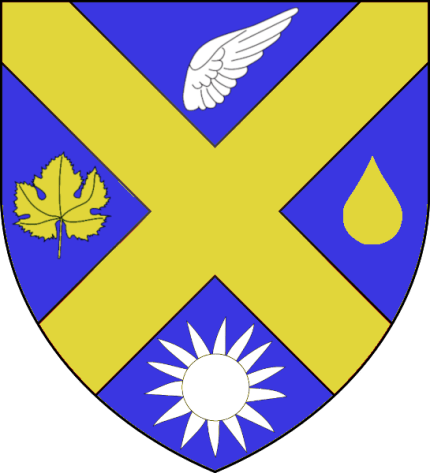D’azur au sautoir d’or, au demi vol d’argent, à la feuille d’or, à la goutte d’or aussi, au soleil d’argent aussi.
