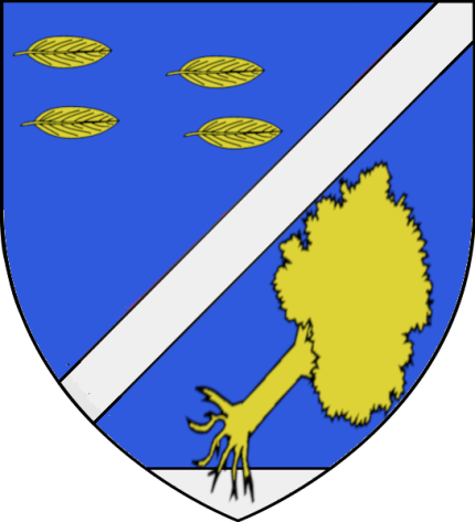 D’azur à la cotice en barre d’argent accompagnée en chef de quatre feuilles d’or posées en fasce ordonnées 2 et 2, en pointe d’une plaine d’argent aussi sommée d’un arbre arraché d’or aussi, mis en barre.
