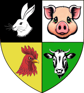 Ecartelé, de sable à la tête de lapin d’argent, du même à la rencontre de cochon de pourpre, d’or à la tête de coq contournée, de gueules, de sinople à la tête de vache d’argent et de sable.