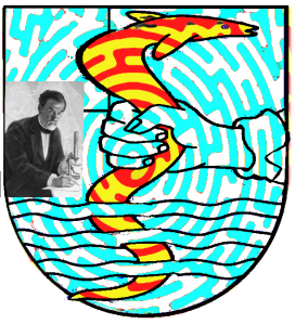 Barré d’argent et d’azur chargé d’un dragon de gueules issant de la pointe senestre , à la fasce du même chargée de trois croix grecques d’or.