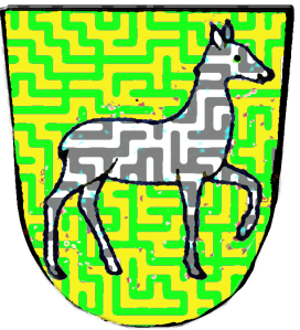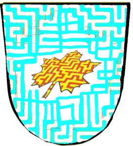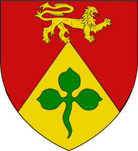 De gueules chargé d’un lion passant d’or, contourné, mantelé du même chargé d’un trèfle de sinople.
