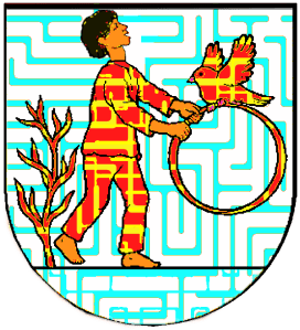 Tiercé en pairle, le 1 palé d’or et de gueules, le 2 d’azur chargé d’un besant d’or accompagné de deux ailes d’argent, le 3 du même à la silhouette stylisée de cygne contourné, de sable.