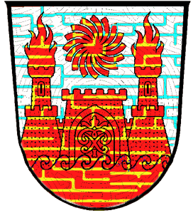 De gueules au pal adextré d’hermine, à la clef d’or posée en pal, accompagnée à dextre et à senestre de deux bougies d’argent allumées d’or aussi.