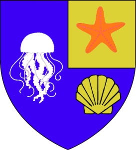 D’azur au franc quartier d’or à senestre chargé d’une étoile de mer d’orangé, une méduse d’argent à dextre, une coquille d’or aussi, à senestre en pointe.