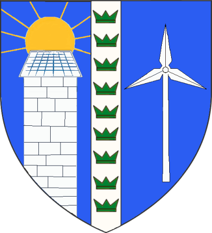 D’azur au pal d’argent semé de couronnes de sinople, au panneau solaire d’argent surmonté d’un soleil d’or, à l’éolienne d’argent.