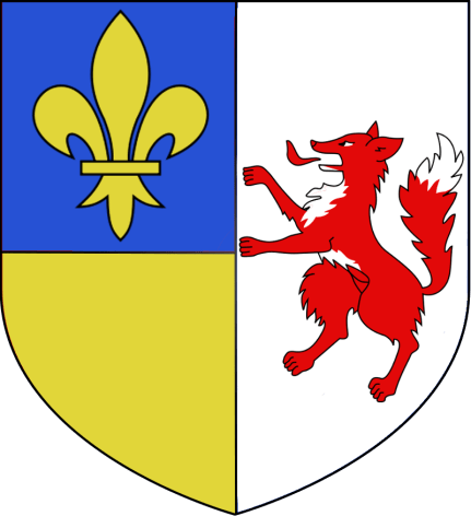 Parti mi-coupé à dextre d’azur, d’argent et d’or, le 1 chargé d’une fleur de lys d’or aussi, le 2 chargé d’un renard au naturel, ravissant.