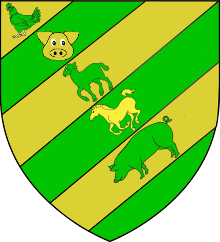 De sinople à trois barres d’or, le 1 chargé d’une poule, le 2 à la rencontre de porc, le 3 au mouton, le 4 au cheval élancé, le 5 au porc, le tout de l’un à l’autre