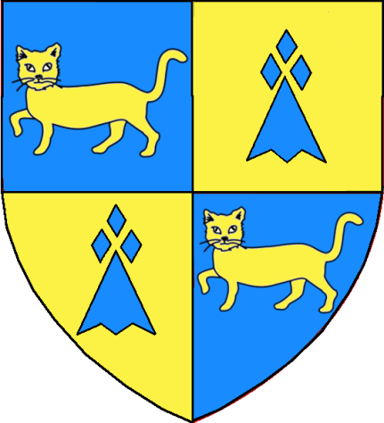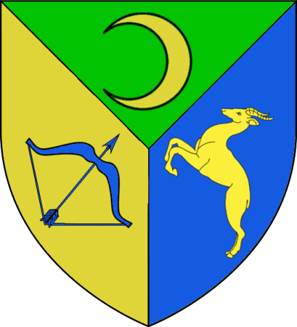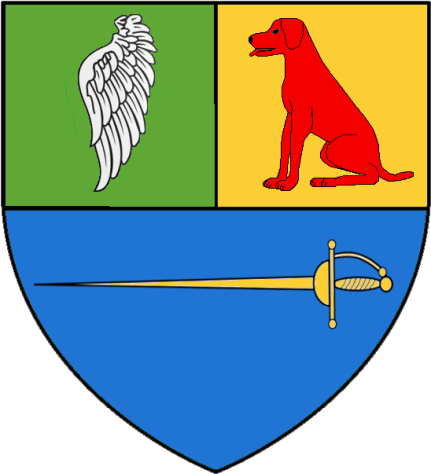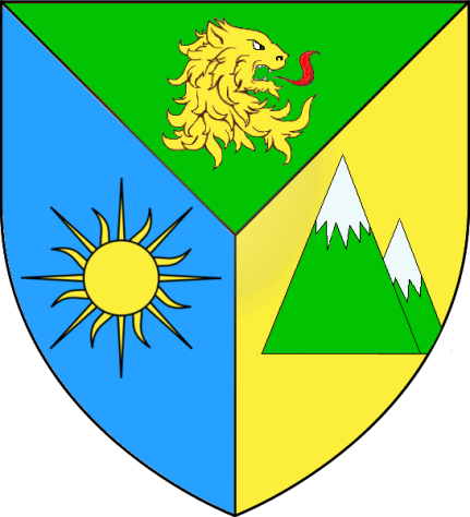 Tiercé en pairle, de sinople, d’azur et d’or, le 1 chargé d’une tête de lion d’or, contournée, le 2 chargé d’un soleil non figuré d’or aussi, le 3 chargé de deux montagnes de sinople aussi, enneigées d’argent, la seconde plus petite.